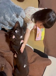 シールを貼る事が今のお気に入りの遊びで、台紙代わりに犬にペタペタと貼っています。
